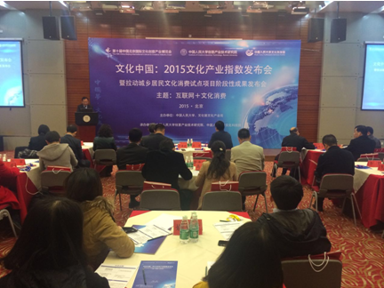 由文化部文化产业司与中国人民大学联合主办的“文化中国:中国文化产业指数发布会暨拉动城乡居民文化消费试点项目阶段成果发布会”在中国人民大学文化大厦举行。本次发布会主题为“互联网+文化消费”。文化部文化产业司司长吴江波,中国人民大学副校长查显友,北京市海淀区委宣传部部长陈名杰,以及各地政府、高等院校和文化企业的近百名代表出席会议。