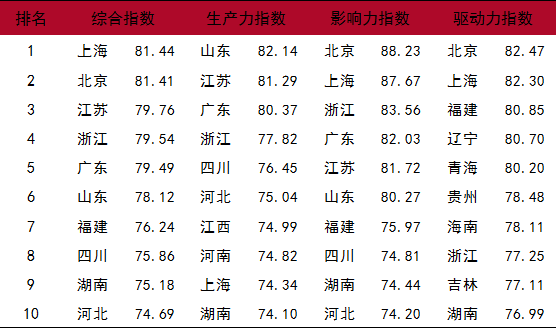 “中国省市文化产业发展指数(2015)”表明,我国各省市文化产业总体保持持续稳步增长。在综合指数一项中,各省市综合指数排序与2014年相比有小幅变动,上海首次以微弱优势超过北京成为第一名,福建、四川进入全国前十名。从数值上看,全国省市文化产业指数的均值达到了73.65,比去年73.61略有上升,从增速上面来看,2015年指数增速相对于2014年增速有所放缓。生产力指数方面,各省市排名与2014年相比整体上变化浮动较小。驱动力指数方面,和2014年相比,上海、福建、海南、吉林、四川等省份上升幅度较大。影响力指数方面,东部地区文化产业经济影响和社会影响比较明显,前十名的省市中,就有8个来自东部沿海发达地区。