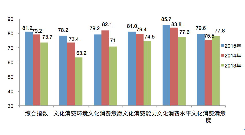 “中国文化消费指数(2015)”表明,我国文化消费综合指数由2013年的73.7增至2015年的81.2,平均增长率为5%。文化消费环境、文化消费能力、文化消费水平指数等一级指标均呈上升趋势,且文化消费环境指数上升速度最快,平均增长率为11.33%,文化消费意愿指数在经历了2014年的上涨后,有小幅回落,文化消费满意度指数在2014年有所下降后,出现了大幅提升。