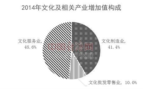 按行业分,2014年文化制造业增加值9913亿元,比上年增长8.2%,占文化及相关产业增加值的比重为41.4%;文化批发零售业增加值2386亿元,增长11.2%,占10.0%;文化服务业增加值11641亿元,增长15.9%,占48.6%。