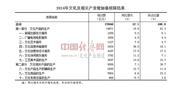 国家统计局网站26日消息,根据《文化及相关产业分类(2012)》和《文化及相关产业增加值核算方法》,经国家统计局核算,2014年全国文化及相关产业增加值23940亿元,比上年增长12.1%(未扣除价格因素),比同期GDP现价增速高3.9个百分点;占GDP的比重为3.76%,比上年提高0.13个百分点。核算数据表明,文化及相关产业在稳增长、调结构中发挥了积极作用。