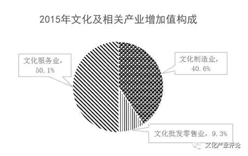 按行业分,2015年文化制造业增加值11053亿元,比上年增长8.4%,占文化及相关产业增加值的比重为40.6%;文化批发零售业增加值2542亿元,增长6.6%,占9.3%;文化服务业增加值13640亿元,增长14.1%,占50.1%。