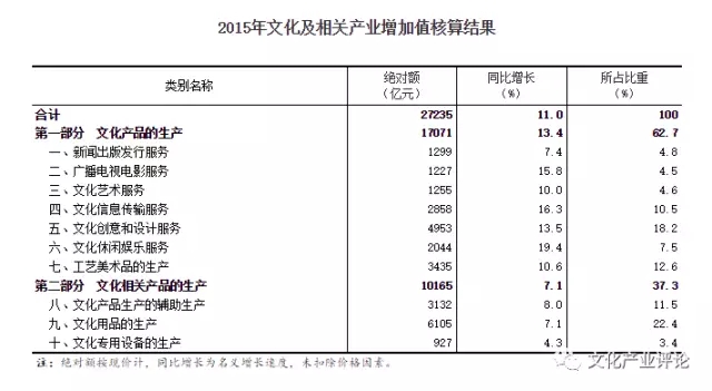 根据《文化及相关产业分类(2012)》和《文化及相关产业增加值核算方法》,经国家统计局核算,2015年全国文化及相关产业增加值27235亿元,比上年增长11%(未扣除价格因素),比同期GDP名义增速高4.6个百分点;占GDP的比重为3.97%,比上年提高0.16个百分点。核算数据表明,文化及相关产业是当前经济增长的一个亮点,总量持续快速增长,比重日益上升,在推动经济发展、优化经济结构中发挥着越来越重要的作用,朝着成为国民经济支柱产业的方向迈出新的步伐。