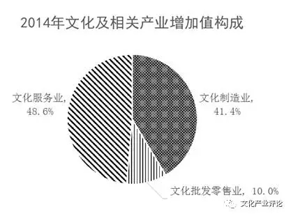 按行业分,2014年文化制造业增加值9913亿元,比上年增长8.2%,占文化及相关产业增加值的比重为41.4%;文化批发零售业增加值2386亿元,增长11.2%,占10.0%;文化服务业增加值11641亿元,增长15.9%,占48.6%。
