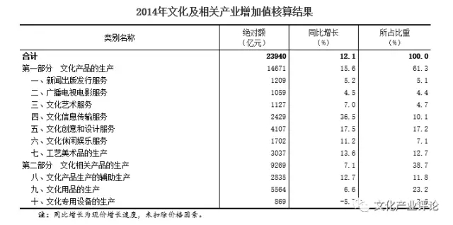 根据《文化及相关产业分类(2012)》和《文化及相关产业增加值核算方法》,经国家统计局核算,2014年全国文化及相关产业增加值23940亿元,比上年增长12.1%(未扣除价格因素),比同期GDP现价增速高3.9个百分点;占GDP的比重为3.76%,比上年提高0.13个百分点。核算数据表明,文化及相关产业在稳增长、调结构中发挥了积极作用。