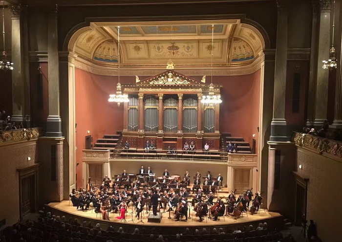 当晚,鲁道夫宫音乐厅1100多个座位座无虚席。上半场音乐会以捷克交响乐名曲《伏尔塔瓦河》开场,《皇帝圆舞曲》、《丰收渔歌》、《斯拉夫舞曲10号》和《红旗颂》等中外名曲依次奏响。李新星的小提琴独奏《丰收渔歌》优美的旋律、欢快的气氛让观众陶醉在富有诗意的夜色中。