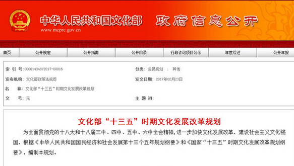 4月19日,在苏州举行的文化部2017年文化产业工作会议正式发布了《文化部“十三五”时期文化产业发展规划》。《规划》明确了“十三五”时期文化产业发展的总体要求、主要任务、重点行业和保障措施,并以8个专栏列出22项重大工程和项目,着力增强可操作性,是指导“十三五”时期文化系统文化产业工作的总体规划。