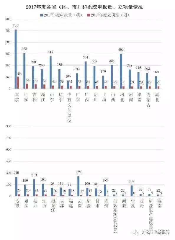从“评审报告”中能看出,北京、江苏、吉林位居申报量和立项量的前三甲。从数据看,各地区间的立项差距逐步缩小,53%地区的立项项目数量在20项至50项之间,覆盖了东部和中部大部分地区,以及艺术发展情况较好的部分西部地区。江苏、广东、辽宁等省由于文化行政部门高度重视,加大了工作力度,艺术机构、单位和艺术家个人的申报量和立项量在全国的位次都有明显前移。河北、云南、安徽等省积极组织,申报量较高,但立项率还有待提高,应防止项目同质化、一般化。西藏、青海、海南等省区的申报率和立项率都不高,还需要进一步挖掘当地文化艺术资源,组织策划项目。