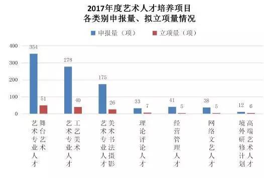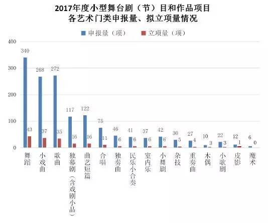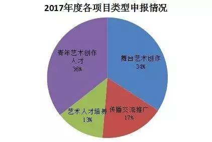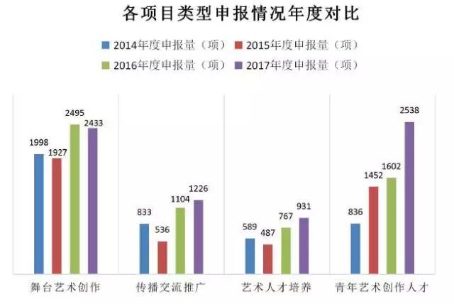总体看,2017年度“舞台艺术创作”“青年艺术创作人才”“传播交流推广”“艺术人才培养”四类项目的申报总量,与2016年度相比,增加了1160项,同比增长了19.4%。舞台艺术创作项目2433项,占申报总量34.1%,其中,大型舞台剧和作品项目966项,较上一年度减少140项;小型剧(节)目和作品项目1467项,较上一年度增加了78项,增幅约6%。青年艺术创作人才项目2538项,较上一年度增加936项,增幅约58%;传播交流推广项目1226项,较上一年度增加122项,增幅11.1%;艺术人才培养项目931项,较上一年度增加164项,增幅21.4%。