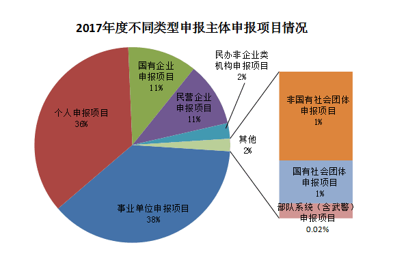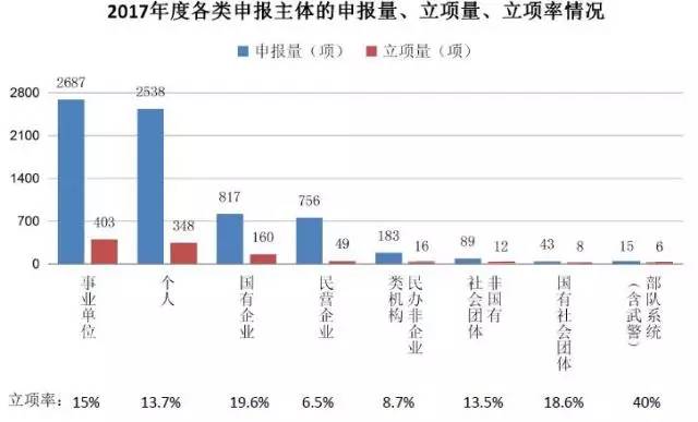 从各类申报主体的申报量、立项量和立项率看,国有机构申报3562项,立项资助577项,立项率约16.2%,略高于平均值;非国有机构申报1028项,立项资助77项,立项率约7.5%,低于平均值,但较上一年度提高了约1.5个百分点。