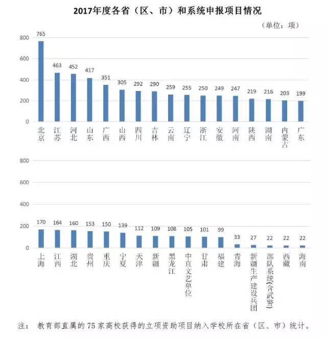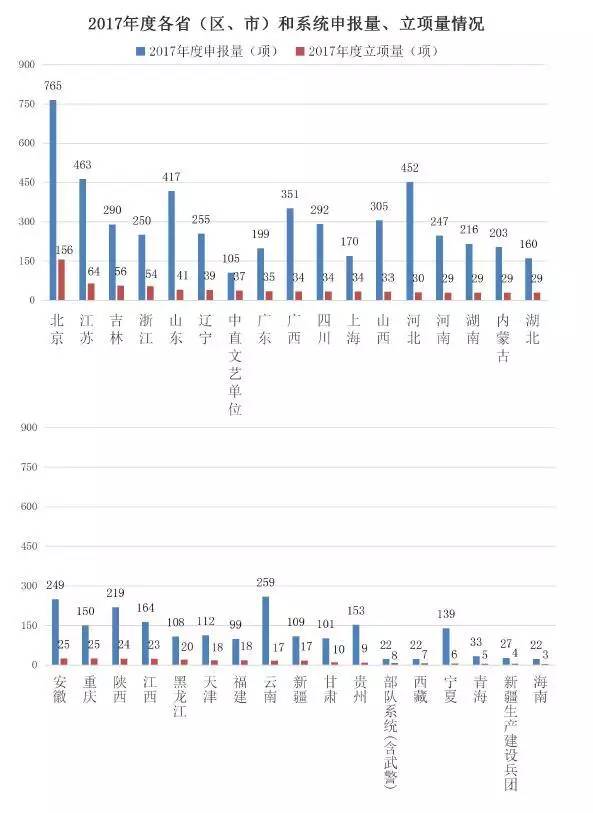 2017年度,申报主体分布广泛。国内各省(区、市)、新疆生产建设兵团和部队系统(含武警),以及中央部委办局直属部门都有机构和个人申报了艺术基金。申报量依次为:北京765项,江苏463项,河北452项,山东417项,广西351项,山西305项,四川292项,吉林290项,云南259项,辽宁255项,浙江250项,安徽249项,河南247项,陕西219项,湖南216项,内蒙古203项,广东199项,上海170项,江西164项,湖北160项,贵州153项,重庆150项,宁夏139项,天津112项,新疆109项,黑龙江108项,中直文艺单位105项,甘肃101项,福建99项,青海33项,新疆生产建设兵团27项,部队系统(含武警)22项,西藏22项,海南22项。