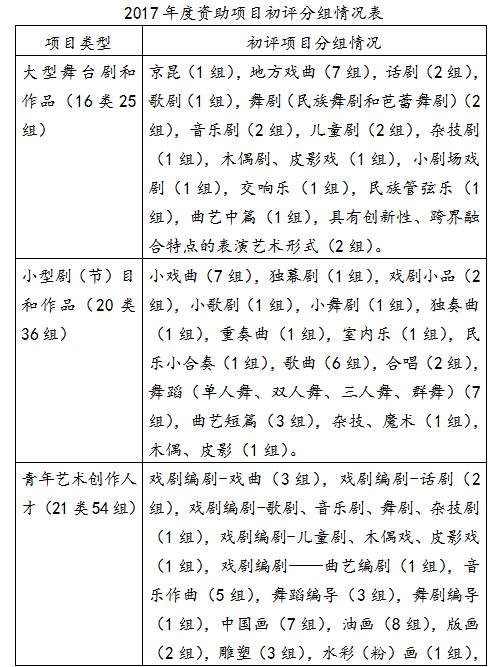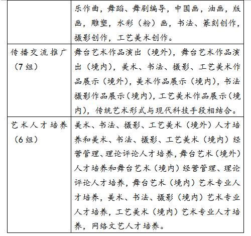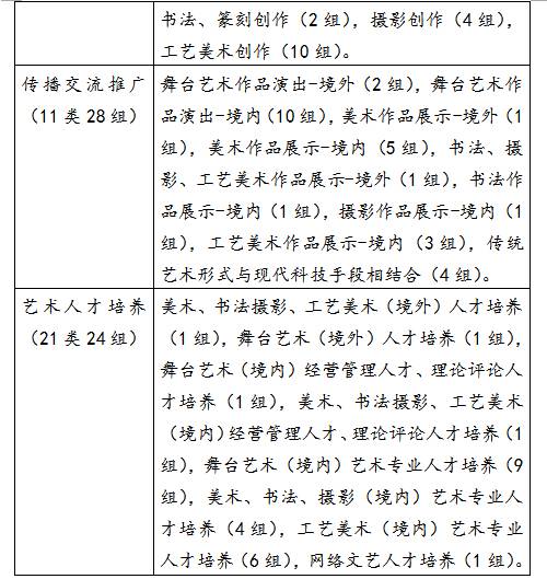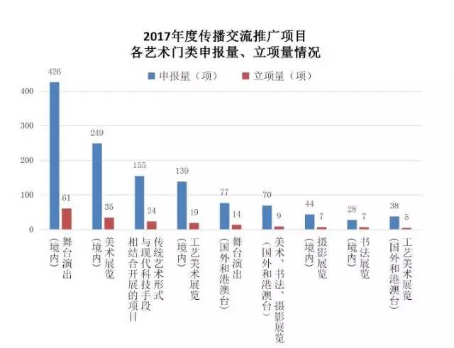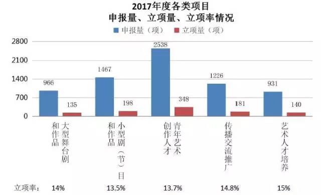 大型舞台剧和作品,申报966项,进入复评230项,立项资助135项,立项率14%;小型剧(节)目和作品,申报1467项,进入复评384项,立项资助198项,立项率13.5%;青年艺术创作人才,申报2538项,进入复评678项,立项资助348项,立项率13.7%;传播交流推广,申报1226项,进入复评329项,立项资助181项,立项率14.8%;艺术人才培养,申报931项,进入复评262项,立项资助140项,立项率15%。