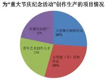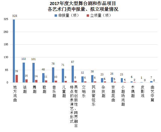 大型舞台剧和作品立项135项,立项率14%。其中,京剧、昆曲、地方戏曲、民族舞剧、民族歌剧、民族管弦乐等传统艺术形式获得资助项目数量为70项,占新创作项目52%,契合了对于传统民族文化艺术的支持。