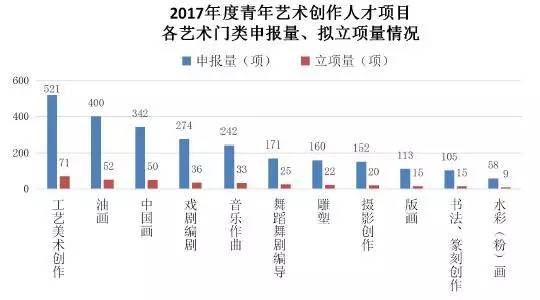 2017年度,青年艺术创作人才项目立项348项,立项率约13.7%。从今年的申报情况看,青年艺术创作者申报此类项目积极性很高,较上一年度申报项目数量增长58%。其中,美术、工艺美术申报数量仍然较多,项目质量较好。音乐作曲、戏剧编剧,申报项目数量较上一年度分别增加了99项、71项,其中,戏曲和话剧青年编剧提交的代表作品具有一定艺术水准,反映出创作者较大的艺术潜力。