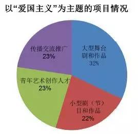 关键词三:“爱国主义”,以爱国主义主旋律为主题的项目53项,生动体现民族精神,反映各族人民大团结,维护祖国统一,海外儿女心向祖国的心路历程。其中,大型舞台剧和作品17项,小型剧(节)目和作品12项,青年艺术创作人才12项,传播交流推广12项。大型舞台剧和作品在此类项目中占比最高,为32%。
