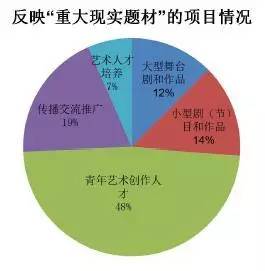 关键词五:“重大现实题材”,以展现我国国民经济和社会发展重大战略为主题、题材的项目168项,主要包括“全面建成小康社会、全面深化改革、全面依法治国、全面从严治党”和“一带一路”“京津冀一体化”“长江经济带”“美丽中国”“精准扶贫”“强军梦”“西部大开发”“泛珠三角区域”“东北地区等老工业基地”“航空航天”“高铁建设”“南水北调”“西气东输”等。其中,大型舞台剧和作品21项,小型剧(节)目和作品23项,青年艺术创作人才81项,传播交流推广32项,艺术人才培养11项。青年艺术创作人才在此类项目中占比最高,为48%。