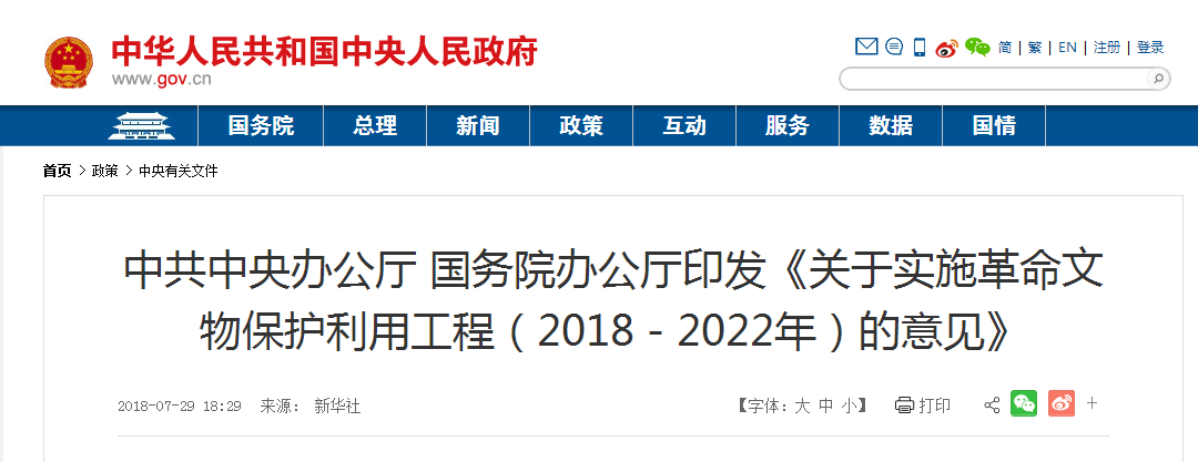 近日,中共中央办公厅、国务院办公厅印发了《关于实施革命文物保护利用工程(2018-2022年)的意见》(以下简称“《意见》”),《意见》明确了实施革命文物保护利用工程的重要意义、总体要求、五项主要任务和六项重点项目,并将从四个方面进行保障,要求各地区各部门结合实际认真贯彻落实。