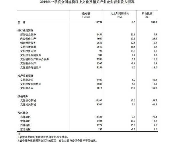 据对全国规模以上文化及相关产业5.5万家企业调查,2019年一季度,上述企业实现营业收入19799亿元,按可比口径计算(详见附注6)比上年同期增长8.3%[1]。