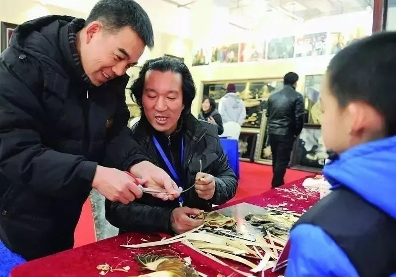 河北工艺美术大师杨丙军(左二)展示芦苇画的制作方法