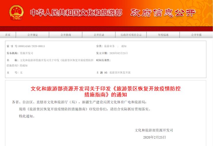 2月25日,文化和旅游部发布了《旅游景区恢复开放疫情防控措施指南》(以下简称“《指南》”)。