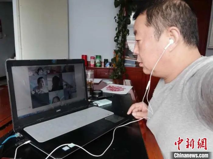 非物质文化遗产丰宁满族剪纸市级代表性传承人李金民通过网络给村民们授课。张艳玲|摄