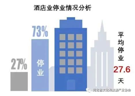 疫情爆发至今,由于客源骤降以及运营风险的不断提升,许多酒店选择停业以减少自身损失。调研显示,2020年1-2月期间,仅有27%的酒店持续营业,73%的酒店选择停业止损,平均停业天数高达27.6天。