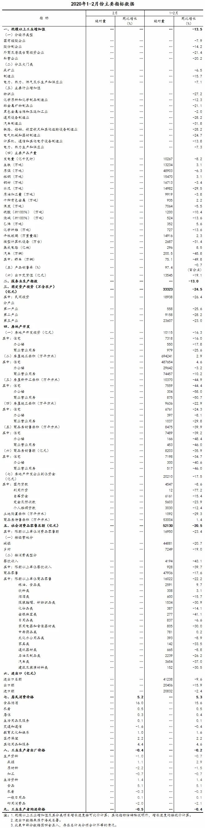 1-2月份,全国固定资产投资(不含农户)33323亿元,同比下降24.5%。分领域看,基础设施投资同比下降30.3%,制造业投资下降31.5%,房地产开发投资下降16.3%。全国商品房销售面积8475万平方米,下降39.9%;商品房销售额8203亿元,下降35.9%。分产业看,第一产业投资下降25.6%,第二产业投资下降28.2%,第三产业投资下降23.0%。民间投资18938亿元,下降26.4%。高技术产业投资下降17.9%,降幅低于全部投资6.6个百分点,其中高技术制造业和高技术服务业投资分别下降16.5%和20.8%。检验检测服务和专业技术服务投资分别增长26.1%和4.3%。社会领域投资下降20.0%,其中卫生领域投资下降11.2%,降幅低于全部投资13.3个百分点。