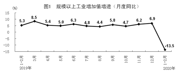 1-2月份,规模以上工业增加值同比下降13.5%。分经济类型看,国有控股企业增加值下降7.9%;股份制企业下降14.2%,外商及港澳台商投资企业下降21.4%;私营企业下降20.2%。分三大门类看,采矿业增加值下降6.5%,制造业下降15.7%,电力、热力、燃气及水生产和供应业下降7.1%。从产品产量看,医疗防护和生活所需物资增长较快,口罩、发酵酒精产量分别增长127.5%和15.6%,冻肉和方便面分别增长13.5%和11.4%。高技术产品增势良好,智能手表、智能手环、半导体分立器件和集成电路产量分别增长119.7%、45.1%、31.4%和8.5%。基本原材料生产平稳,生铁、粗钢、平板玻璃、十种有色金属产量分别增长3.1%、3.1%、2.3%和2.2%。全国采购经理调查数据结果显示,截至2月25日,大中型制造业企业复工率达到85.6%,生产经营活动正有序恢复。