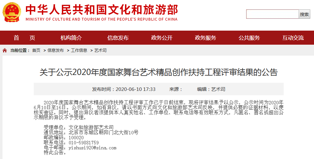 2020年度国家舞台艺术精品创作扶持工程评审工作已于日前结束,现将评审结果予以公示,公示时间为2020年6月10日至16日。公示期间,如有异议,请以书面方式向文化和旅游部艺术司反映,并提供必要的证据材料,以便核实查证。同时,提出异议者须提供本人真实姓名、工作单位、联系电话等有效联系方式,凡匿名、冒名或超出公示期限的异议不予受理。