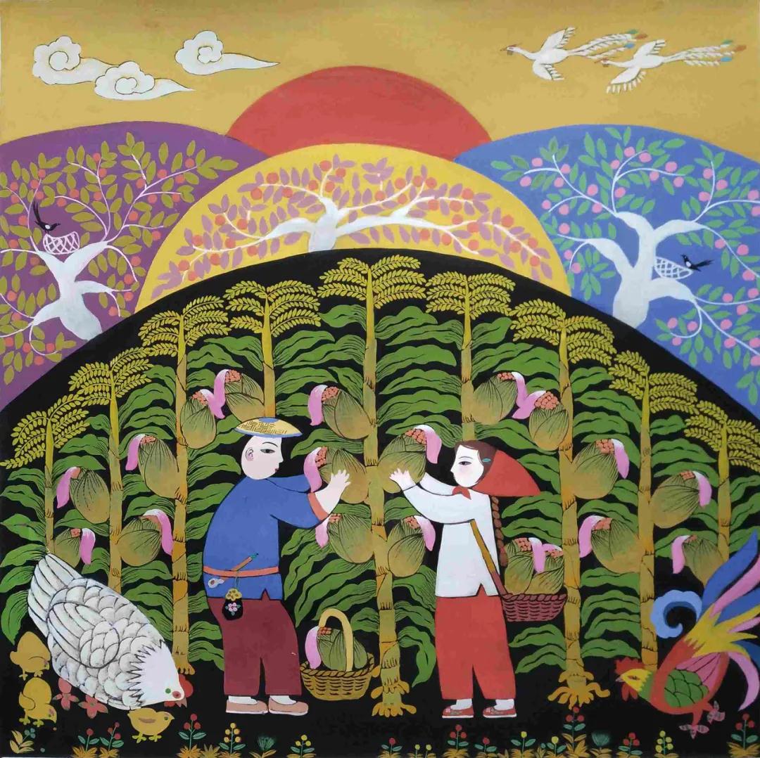 “农民画发展最终还是要在民间美术的基础上实现创新。这个觉醒是农民画的重要转折,面貌由此焕然一新。农民画家们汲取了剪纸、皮影、刺绣、染织、年画、陶瓷、雕刻、玩具等传统民间美术的精华而创新。创作实践中摸索积累,融合新机,掌握要领,熟悉内在奥妙及精髓,将母体语言的内在神韵、造型法则、形式规律及装饰意味等巧妙地转换运用到画中,创造出崭新的现代民间绘画样式。”廖开明认为,从题材内容而言,农民画是画自己的生活,可以说是当事人的画,画中细节真实、丰富、生动。而农民画在中国画坛,还有个最出众之处,即许多少数民族地区画家创作了一大批反映民族生活风情文化的画作。他们的作品带着绮丽的地方风光、多彩的民族风俗、悠久的文化传统、缤纷的生活情景,洋溢着爱家乡、爱中华的热情,激荡着民族和睦团结的亲情,汇成农民画的洋洋大观。它最会讲中国故事,而且真实、生动、感人,因而这种画从内容到形式最具中国味。在我国对外文化交流中,它已成为代表国家的一张文化名片。