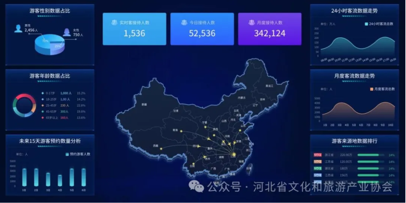 通过SaaS系统各个模块,对经营数据进行展示和分析,为高层提供辅助决策,为运营人员提供流量曲线、营收统计、游客画像等基础数据和分析支持。