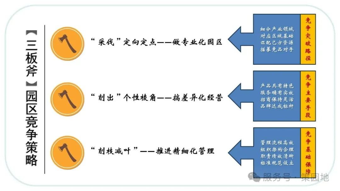 “大处着眼、小处落位”方能解决长期困扰园区的经营发展问题,着眼大局,抛不开产业与地产的博弈性战略布局问题,涉及“产业招商集群 + 资产经营管理”双轨并行的业务组合策略,当然也是轻重资产经营结合问题。此处不谈如上宏大战略,不说操盘细枝末节,就想聊一聊红海市场突围的基本对策,其实不外乎三大策略,通俗讲“三板斧”的连环杀招:做专业化园区、搞差异化经营、推进精细化管理。