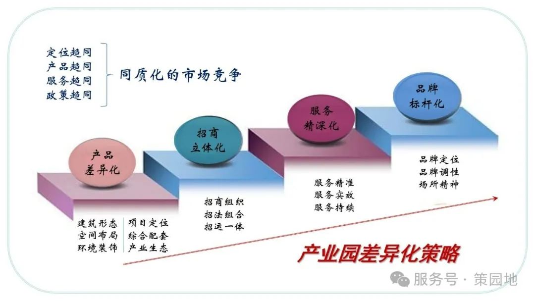 不仅砍柴,还要练就精工细雕的本事。差异化经营是任何行业领域发展到白热化竞争阶段势必祭出的竞争大招,园区差异化是寻求规避“千园一面”的低端恶性竞争。那么园区“搞差异化经营”差异化在哪里?这主要体现在产品差异、服务差异、招商差异和品牌差异。产品差异就是基于园区的专业化定位,围绕园区建筑形态、建筑配套标准以及一系列的园区物理指标,在硬设施、硬件上营造差异化特点。例如,工业园推出具有一定稀缺性的独栋单层厂房,科技园营建办公楼内的室内花园氧吧、文创园建设配套具有人文气息的书店书吧、艺术展厅,等等。